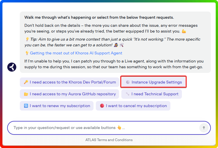 When you select "Instance Upgrade Settings" in the chatbot, you'll see the following options: