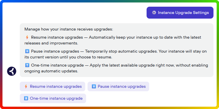 If you're interacting with our AI assistant and need to control how your instance receives software upgrades, you'll be presented with several easy-to-use options under "Instance Upgrade Settings". These settings allow you to decide when and how your instance gets updated — whether automatically, on-demand, or not at all.